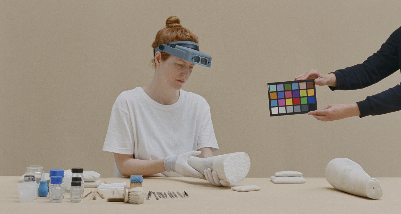FOUR SCULPTURES IN FIFTEEN PIECES befasst sich mit Fragen der Schöpfung und der Zerstörung. Bei den im Film gezeigten Skulpturen handelt es sich um ausgegrabene Fragmente von Ruinen eines estnischen Kunstmuseums, das bei der Bombardierung Tallinns im Frühjahr 1944 zerstört wurde. Die fünfzehn Stücke stammen ursprünglich von vier verschiedenen klassischen Marmorskulpturen, die von Amandus Adamson (1855-1929) und August Weizenberg (1837-1921) geschaffen wurden. Das Werk ist eine Montage von Zerstörung und Schöpfung und fragt nach der Rolle von Museen, die mehr als nur Objekte und Artefakte bewahren. Das institutionelle Element des Museums wird durch den Schauspieler eines professionellen Restaurators verkörpert, der die Skulpturen im inszenierten Raum des Films bearbeitet.